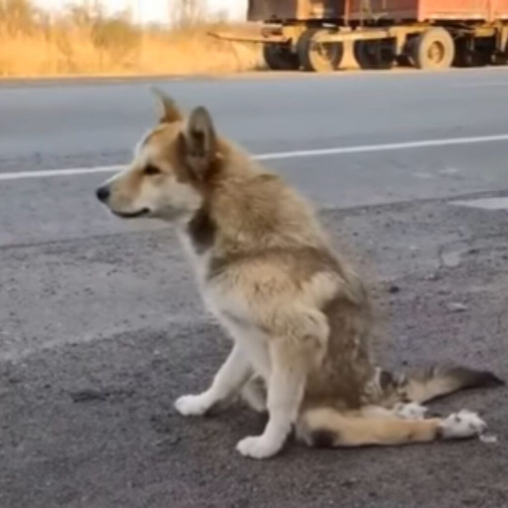 Der Hund kroch langsam über die Bergstraße. Seine Augen suchten den Horizont, als warte er.