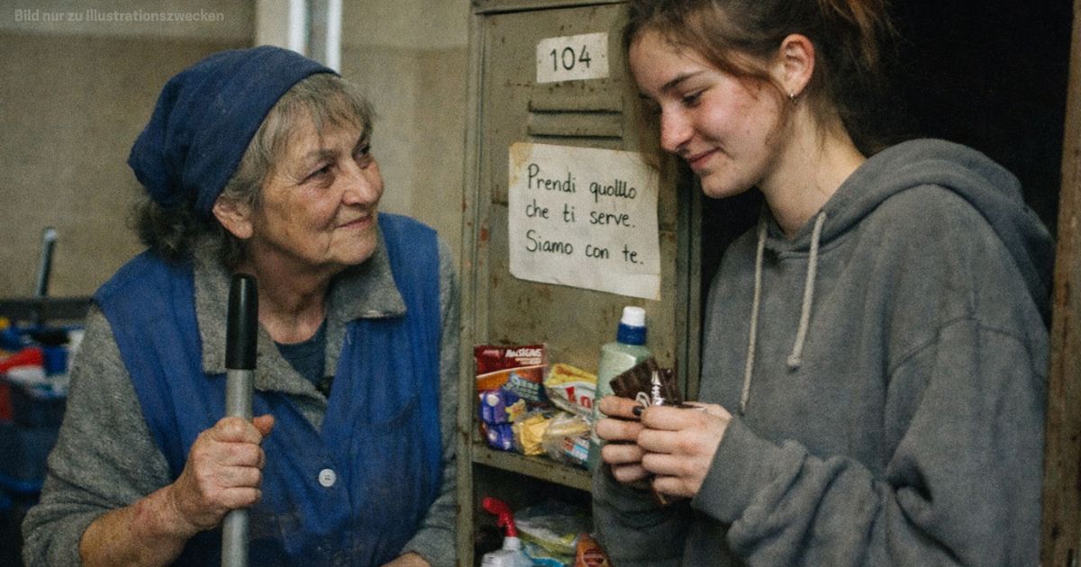 Due settimane dopo, sono andata a controllare l’armadietto. Non era vuoto. Qualcuno aveva lasciato uno shampoo di marca, quasi nuovo. C’era un pacchetto di cracker. Dei campioncini di crema. E un foglietto adesivo scritto con un pennarello luccicante: «Chi può metta, chi non può prenda.»