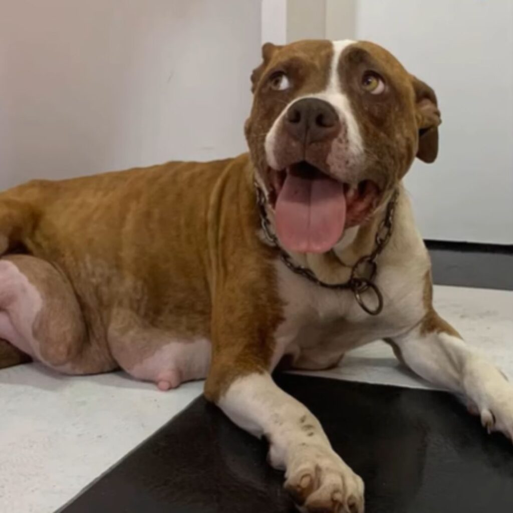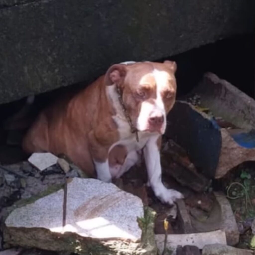 Die schwangere Hündin, eine Pitbull-Mutter, lag vor der Fabrik in Araucária. Der Regen durchnässte den Asphalt, und ihr Bauch, schwer und rund, ruhte auf dem kalten Boden. Sie bewegte sich kaum. Vielleicht hoffte sie auf Schritte, die nicht kamen.
