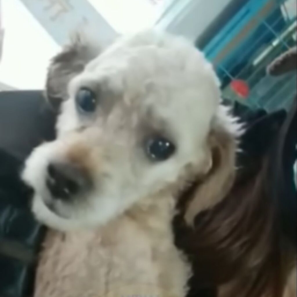 Eine Freiwillige rasierte sein verfilztes Fell.