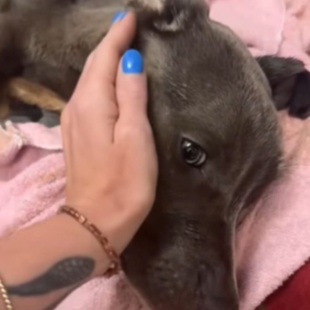 Eine Hündin, abgemagert bis auf die Knochen, mit stumpfem Fell und geschlossenen Lidern.